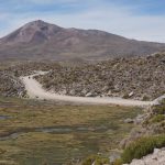 Dann ging es endlich wieder auf‘s Rad. Heute war es fast die gesamte Zeit bedeckt, erst zum Ende der Etappe zeigte sich die Sonne. Mit zunehmender Höhe wurde es zunehmend windiger und kälter. Zum Glück hatten wir den Wind wie auch schon die letzten Tage immer im Rücken. Es war auch so schwer genug. Bei 4565 m war endlich der Kulminationpunkt erreicht und wir hatten eine wunderschöne Aussicht auf die beiden großen schneebedeckten Vulkane Pomerape und Parinacota.