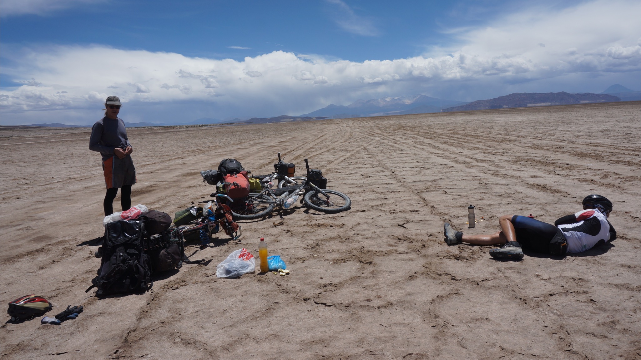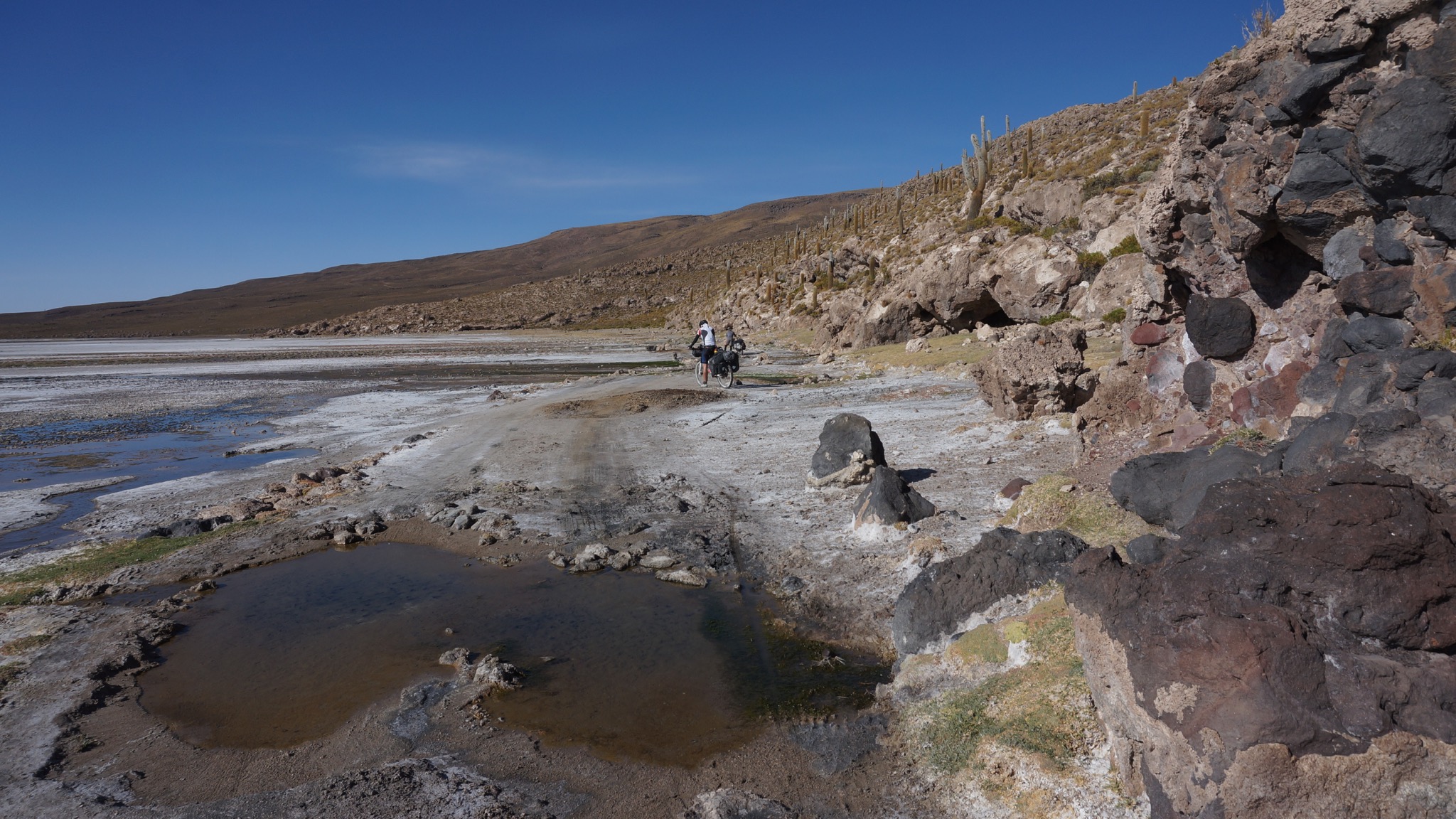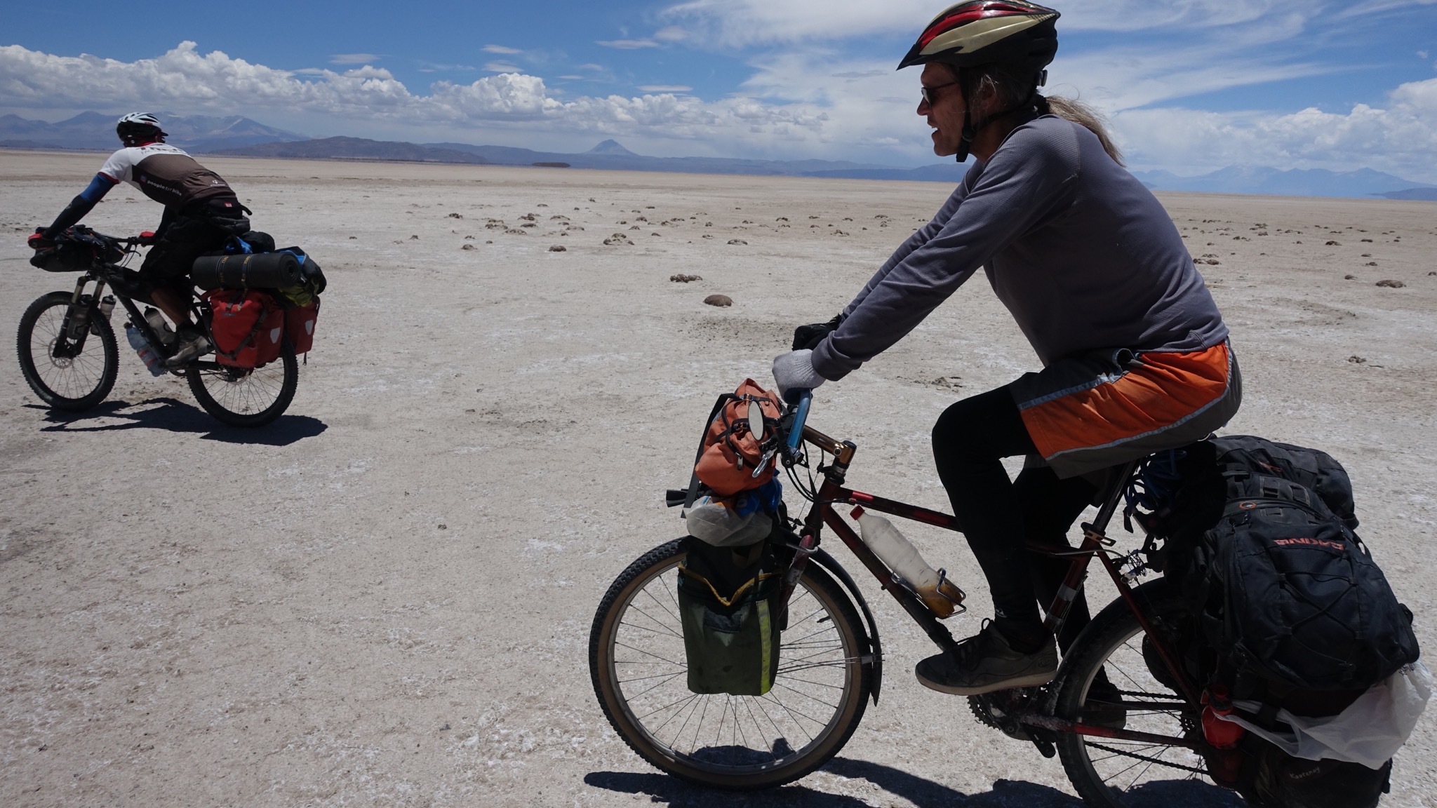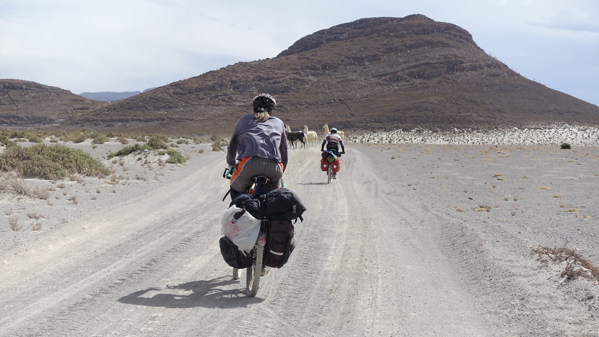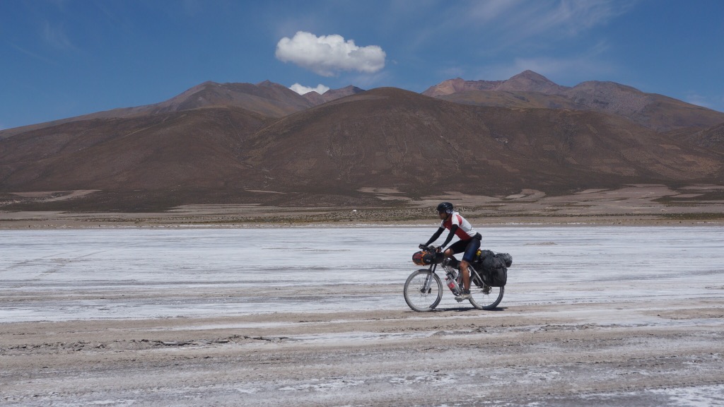 Marc, der Lebenskünstler aus Kanada, begleitete uns. Die ersten etwa 40 km gingen über den Salar. Meist war gut zu pedalieren, lediglich in Ufernähe wurde es etwas zäh, so dass teilweise auch geschoben werden musste. Wir folgten dann dem Salar noch eine Weile, um dann am südlichsten Zipfel nach Süden in Richtung Llica abzubiegen. Hier wurde es dann wieder etwas anspruchsvoller, weil es viele sandige Passagen gab, die ein im Sattel-sitzen-bleiben unmöglich machten.
