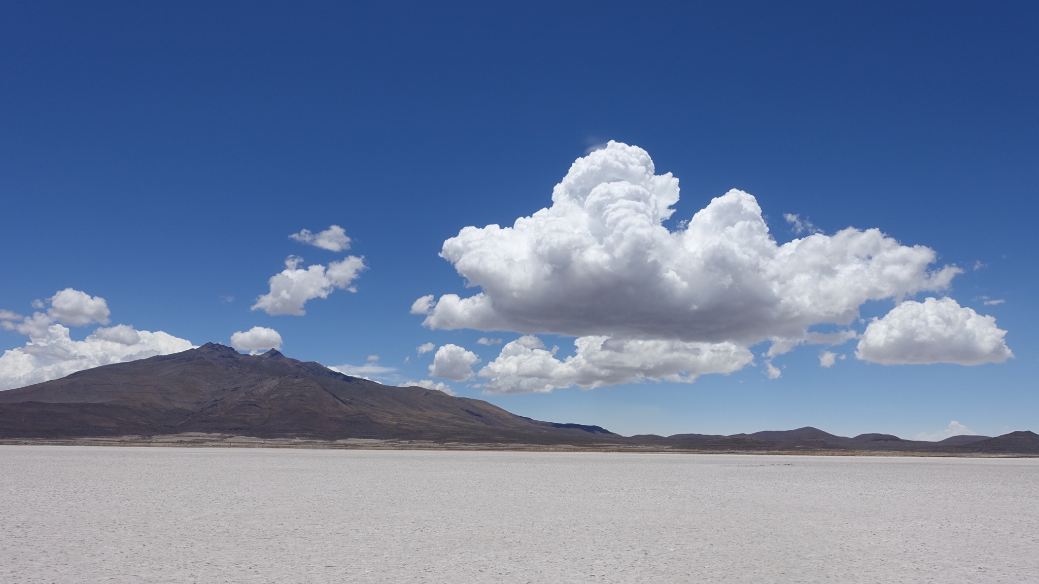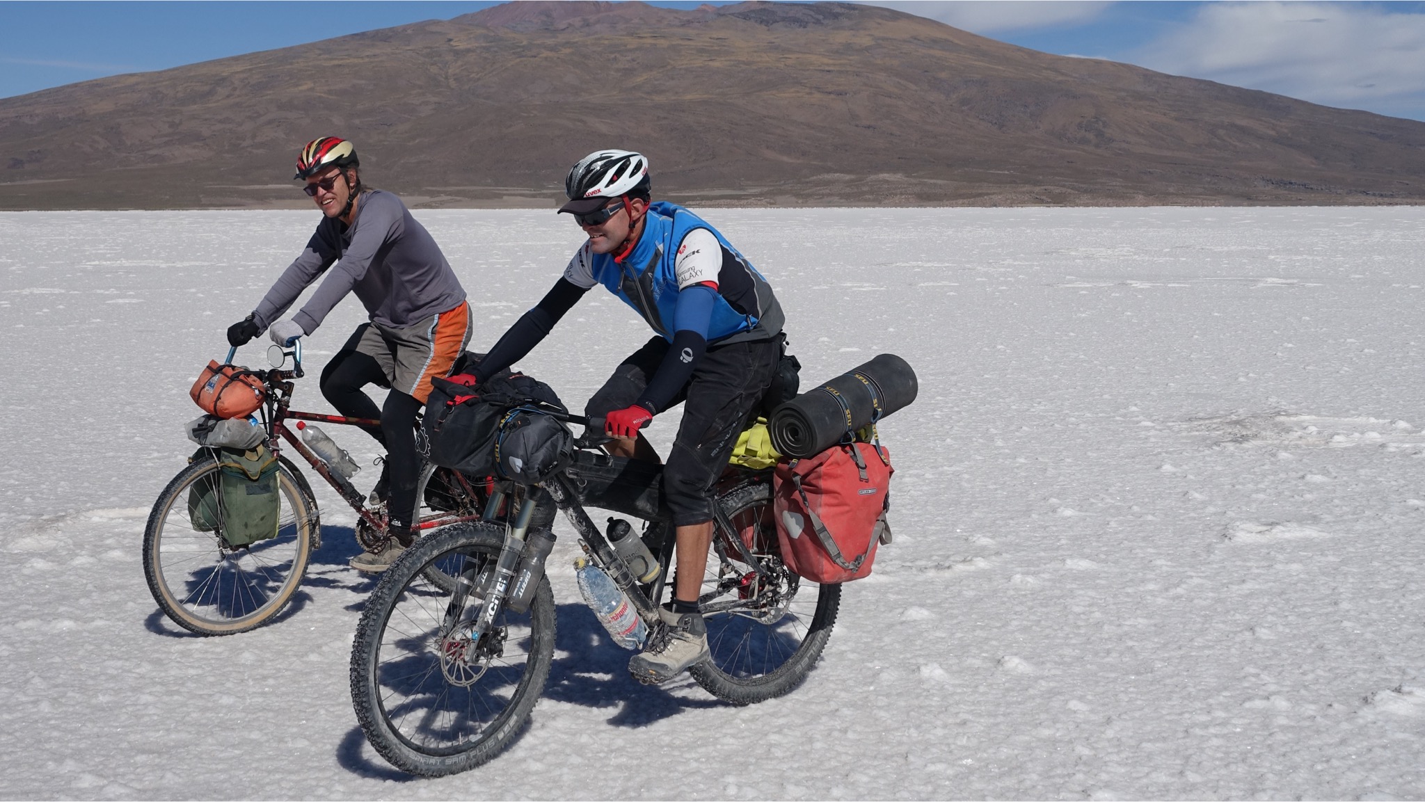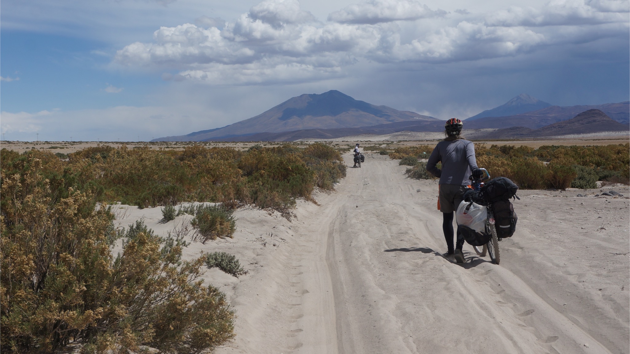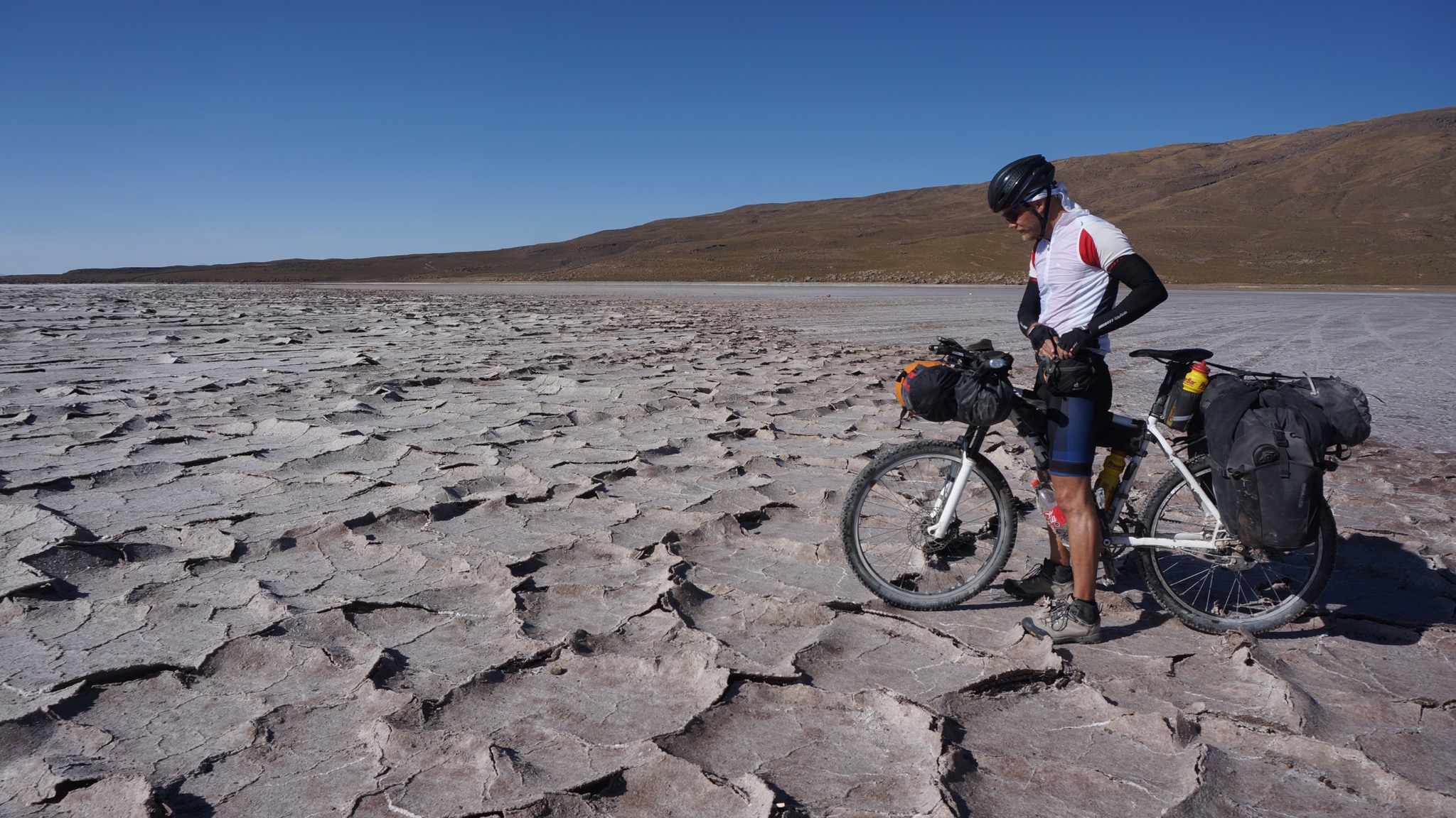 Marc, der Lebenskünstler aus Kanada, begleitete uns. Die ersten etwa 40 km gingen über den Salar. Meist war gut zu pedalieren, lediglich in Ufernähe wurde es etwas zäh, so dass teilweise auch geschoben werden musste. Wir folgten dann dem Salar noch eine Weile, um dann am südlichsten Zipfel nach Süden in Richtung Llica abzubiegen. Hier wurde es dann wieder etwas anspruchsvoller, weil es viele sandige Passagen gab, die ein im Sattel-sitzen-bleiben unmöglich machten.