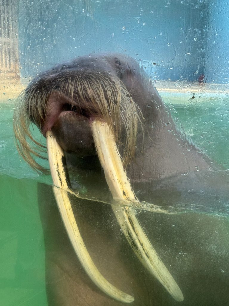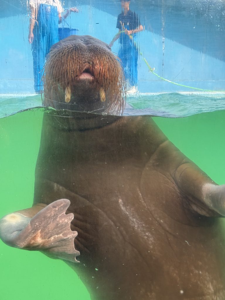 In dem Video oben mit dem Walrossbullen weiß ich nicht, wie das Verhalten zu deuten ist. Er hat immer wieder den Fisch aus dem Maul herausflutschen lassen. Vielleicht eine Verhaltensstörung aufgrund der Gefangenschaft. Oder er wollte die Besucher vielleicht füttern.