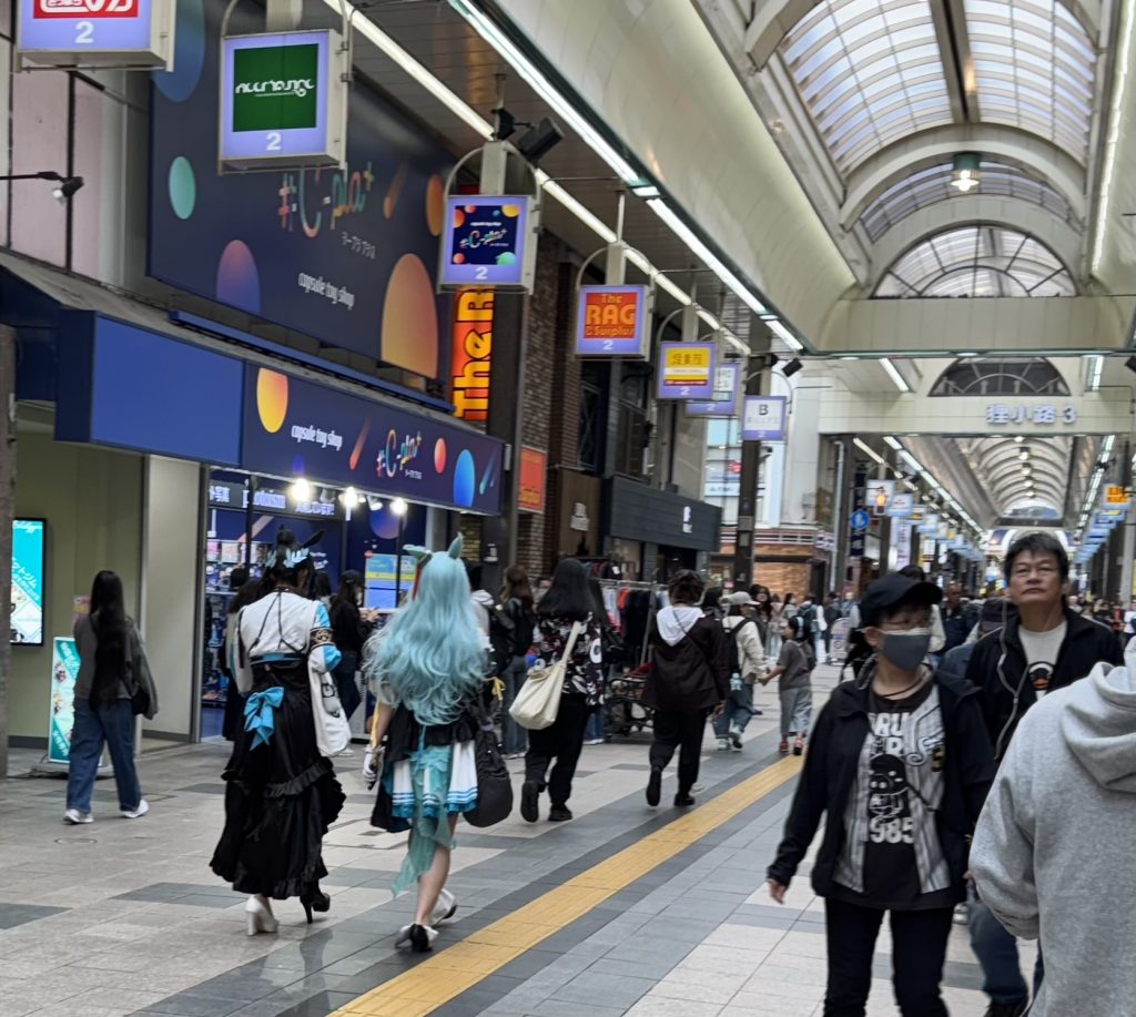 Ansonsten war heute auffällig, dass viele verkleidete Frauen oder Mädchen unterwegs waren. ChatGTP meint, dass sich diese Bewegung wohl Cosplay (Costume+ Play) nennt und in Japan weit verbreitet ist.