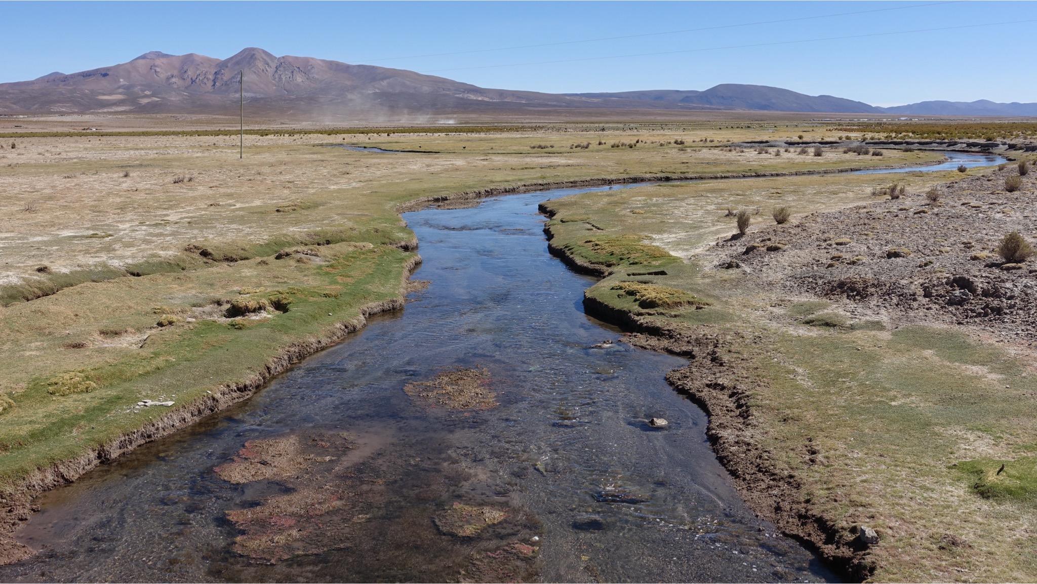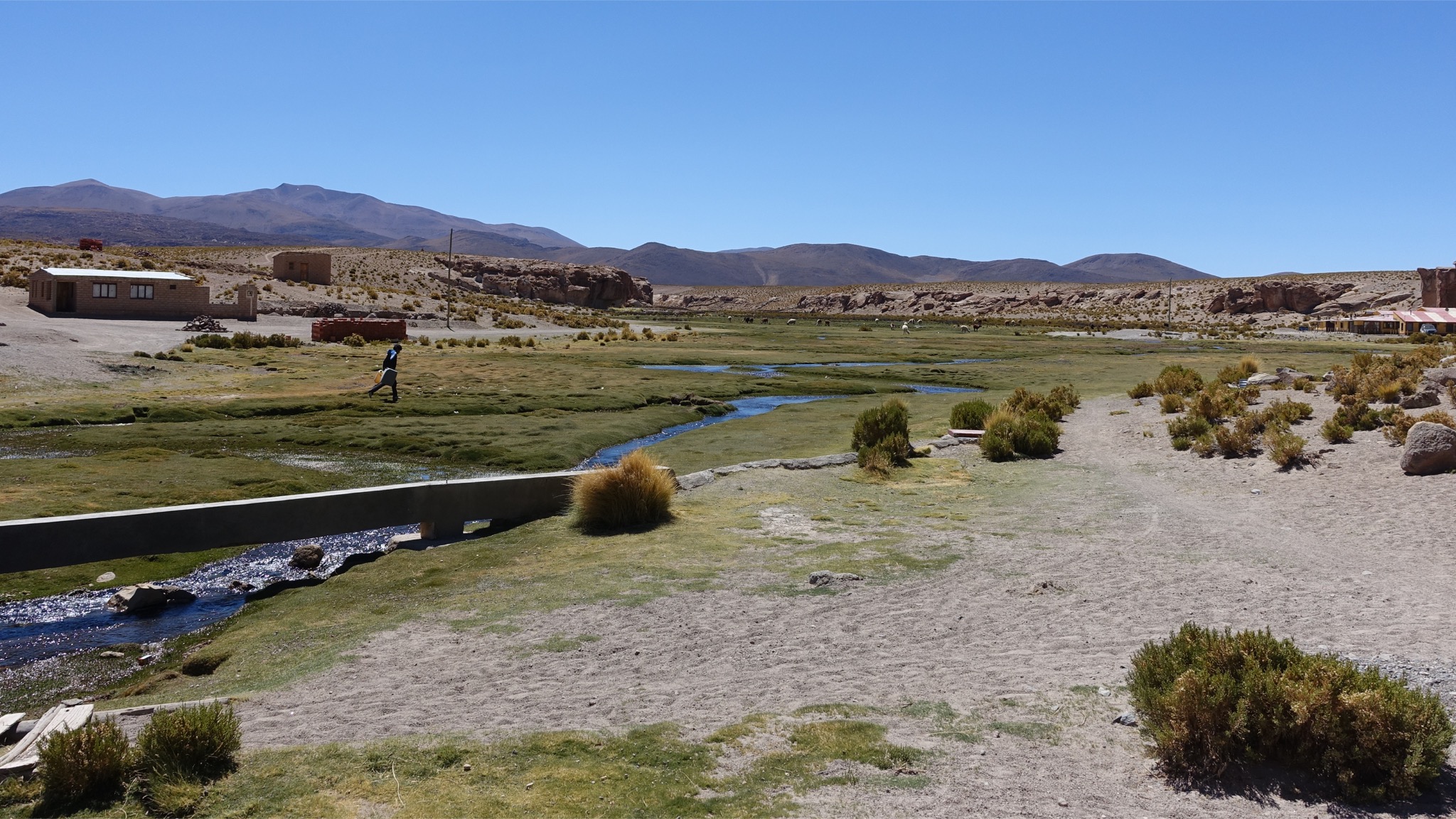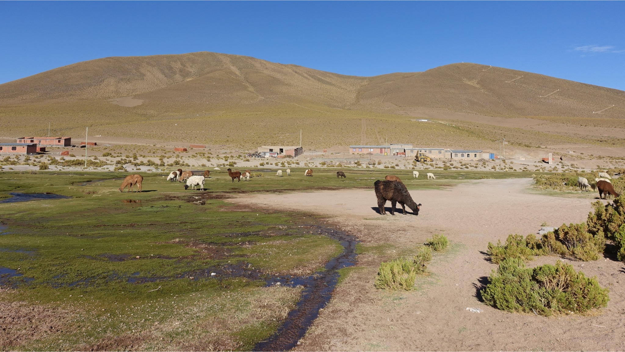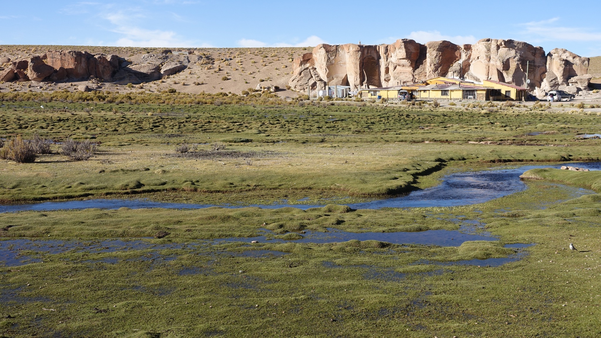Vila Mar ist ein schöner Ort, der sich an eine kleine Felskette schmiegt und wie schon erwähnt von einem kleinen, fröhlich sprudelnden Fluss durchzogen wird, so dass es stellenweise wie eine kleine Oase wirkt. Am Ufer grasen Alpakas und Lamas und es finden sich viele Wasservögel. Mittags um 15 Uhr gab es frittiertes Huhn mit Reis und Pommes. Da war es lecker. Abends gab es das Gleiche noch einmal. Da war es nicht mehr so lecker, da es vermutlich vom Mittag nur warmgehalten wurde.