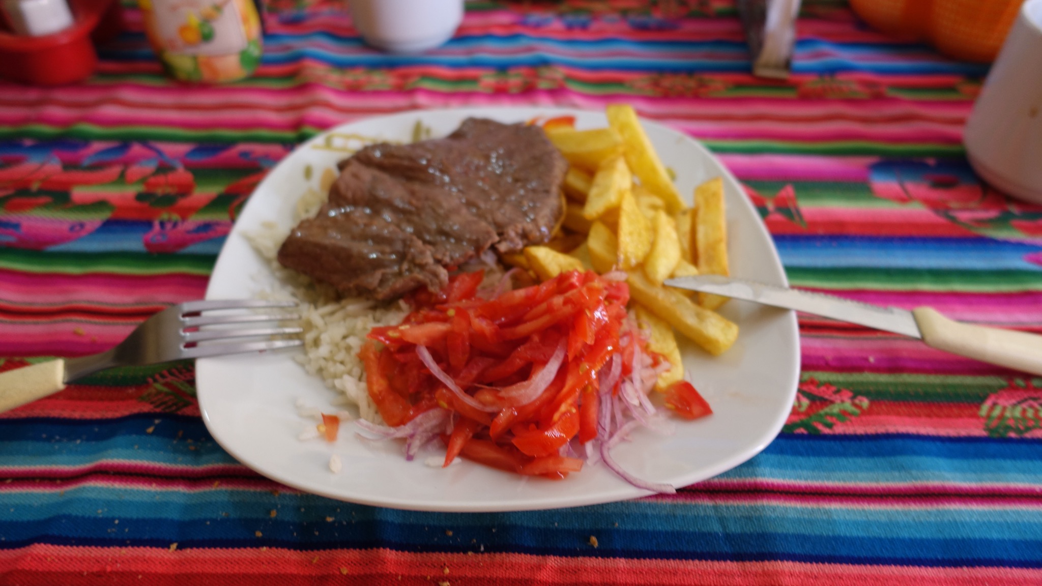 Erst eine leckere Gemüsesuppe und dann ein Lamasteak mit Reis und Pommes.
