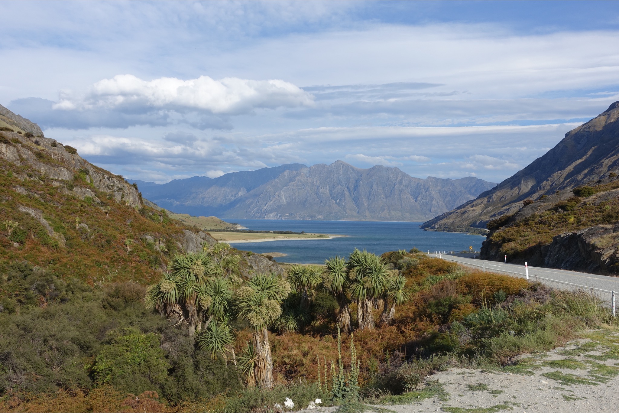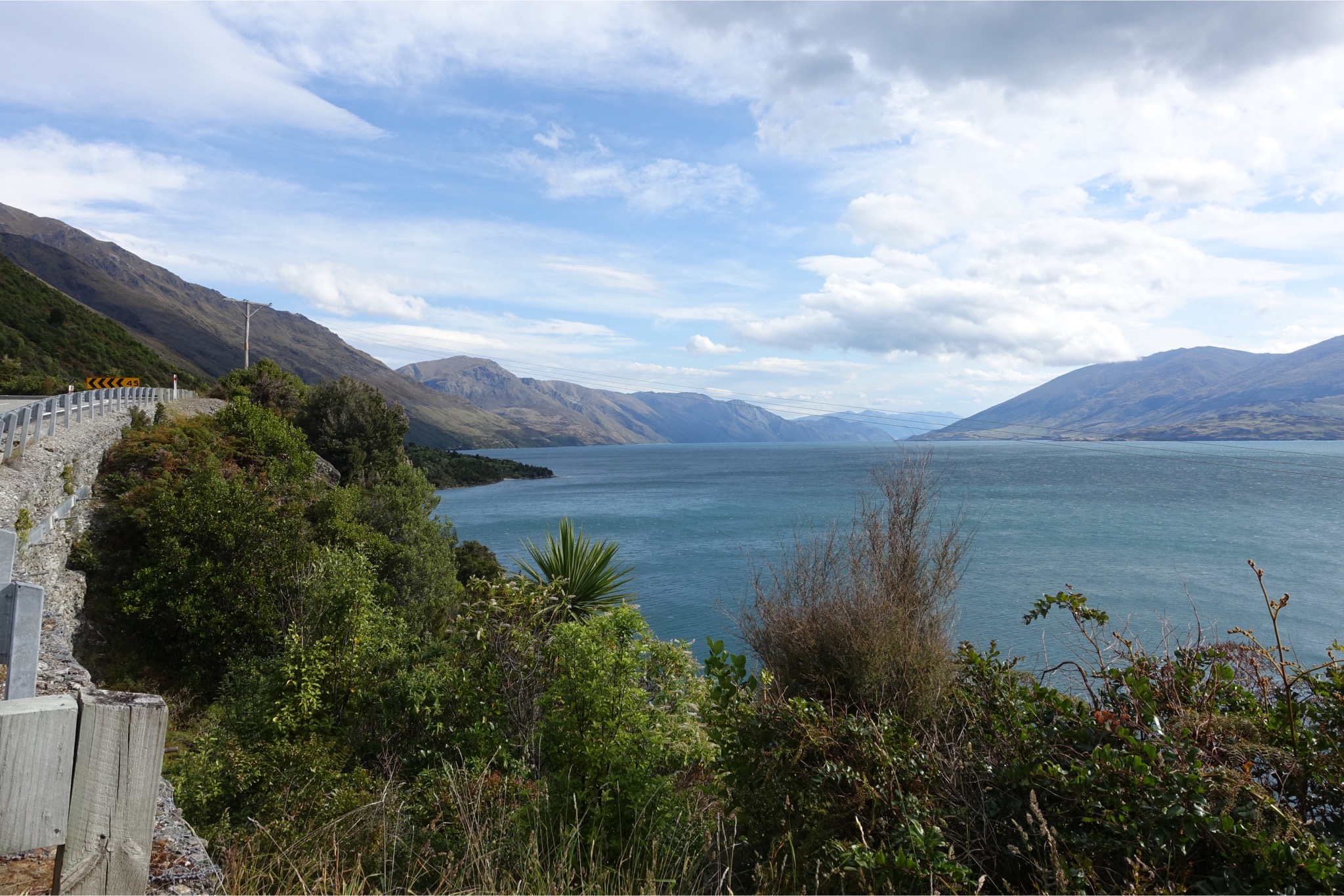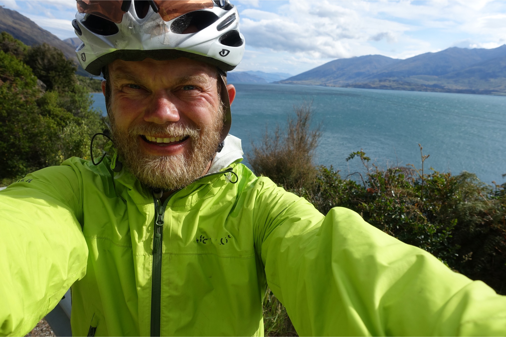Heute stand eine richtig lange Etappe auf dem Programm. Um 5.00 Uhr klingelte das Handy, was aber gar nicht nötig war, die die Keas bereits wieder eingeflogen waren und ordentlich Radau machten. Um 6.30 ging’s auf’s Rad immer den Highway 6 entlang. Eigentlich sah der Himmel gar nicht so schlecht aus, aber nach 20 km fing es an zu regnen. Zum Glück regnete es heute nur einmal: von 7.30 bis 17.00 Uhr 😉. Daher blieben mir Blicke auf die nahen Gipfel aufgrund der extrem tief hängenden Wolken leider verwehrt. Unterwegs gab es an einer Lachsfarm ein leckeres Lachssandwich, ansonsten wurde aus der Radtasche von den Einkäufen vom Vortag gelebt. Die Temperaturen lagen die gesamte Zeit während des Regens bei 12 Grad. Seltsamerweise hat mich der Regen nicht sonderlich gejuckt. Ich habe es mir in meiner Regenjacke gemütlich gemacht und einen Kilometer nach dem anderen abgespult. Nach 118 km gab es die erste Möglichkeit nachzutanken und einen ordentlichen Teller Fisch & Chips zu verdrücken. Und es stellte sich die rhetorische Frage, weiter oder einkehren? Klar, weiter ging’s zu der größten Herausforderung des Tages: dem Haß-Pass. Obwohl es 60 km von dem letzten Ort bis zum Pass sein sollte, wollte es einfach nicht in die Höhe gehen. Erst bei Kilometer 175 ging es dann hinauf, dafür dann aber ordentlich. Auf 8 km von 60 auf 564m. Da kam richtig Freude in den Beinen auf. Aber danach kam die absolute Überraschung: nach 9,5 Stunden Regen hörte dieser auf einmal auf und die Temperaturen stiegen auf unglaubliche 23 Grad. Außerdem war das Tal in dem Milch und Honig fließt erreicht. Ich weiß, dass das mit den Superlativen immer so eine Sache ist, aber die Landschaft an den beiden Seen, an denen ich entlang fuhr, war das Schönste, was ich bisher je gesehen habe. Die Bilder können leider nur bedingt einen Eindruck vermitteln. Unterkunft habe ich nach unglaublichen 264 km und 3100 Hm in Wanaka auf einem Campingplatz gefunden. Damit war es die längste Tour, die ich bisher jemals gefahren bin. Ich werde morgen in Wanaka einen Tag pausieren, um mich zu erholen und die Sachen wieder komplett zu trocknen. Erstaunlicherweise habe ich während dieser extrem langen Etappe (14 Stunden) überhaupt keine Probleme bekommen. Ich führe es auf meinen strikten Ernährungsplan zurück. Der lautet soviel Essen und Trinken wie irgendwie geht.😀 Schade, dass die ersten Stunden vom Wetter her so schlecht waren. Trotzdem war es mit Sicherheit für diesen Urlaub die Königsetappe.