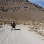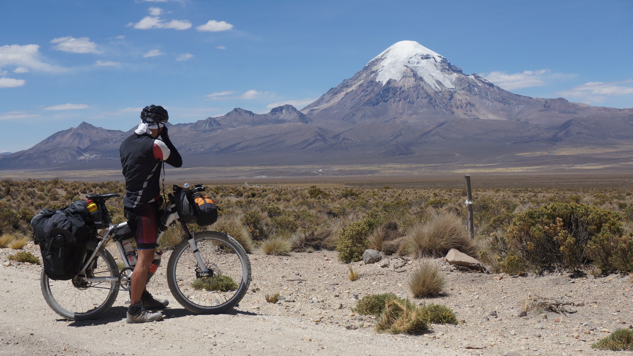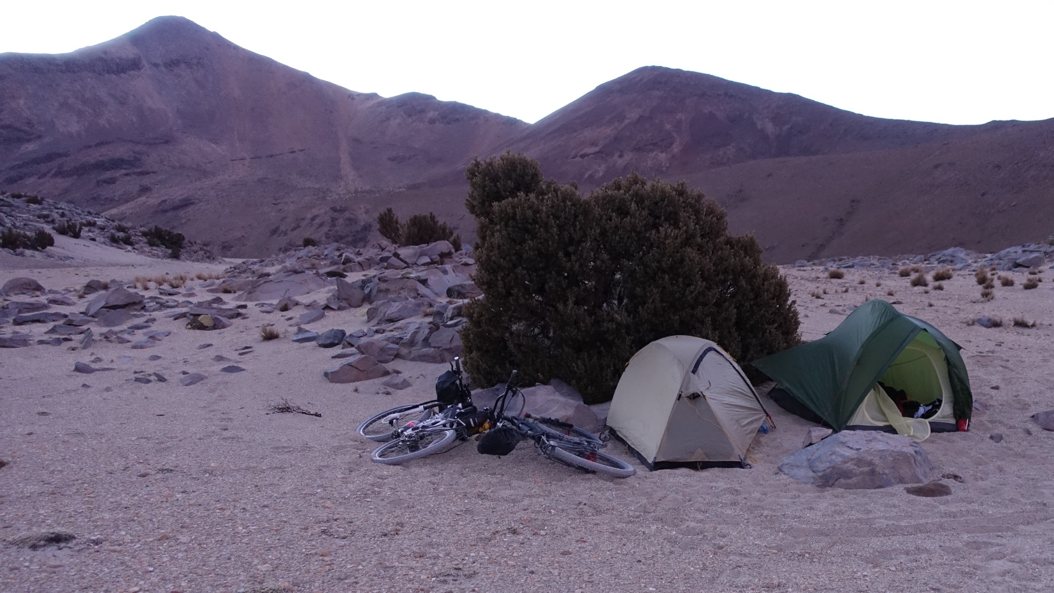 Gut gestärkt sind wir dann auf eine weitere Piste in Richtung Süden abgebogen und dieser dann etwa 12 lm gefolgt. Und dann begann das Sahnestückchen der Tagesetappe. Wir hatten am Vorabend beschlossen, dass wir den Acatengo zumindest ein gutes Stück mit dem Rad bezwingen wollten. Dabei handelt es sich um einen Vulkan mit etwas über 6000 m Höhe. In Radreiseforen gibt es Geschichten, bei denen angeblich Leute mit Gepäck bis auf 4800 m Höhe gefahren sind, dort eine Art Basiscamp gebildet haben und dann bis auf 5400 m mit leichterem Gepäck gefahren sind. Ich weiß nicht, was das für Helden sind. Wir haben heute auch etwas über 4700 m erreicht und unsere Zelte im Schutz einer der wenigen Büsche aufgeschlagen. Aber wir haben die rund 300 Höhenmeter größtenteils geschoben. Die Piste war total versandet, teilweise richtig steil und zu allem Überfluss hatten wir noch sehr starken Gegenwind.