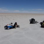 Von Llica zum See war ein recht entspanntes Fahren. 20 km leichte Piste, dann war das erste Ziel erreicht, das Ufer des Salzsees. Auf dem See gab es dann riesige Fahrspuren, die wie eine Autobahn wirkten und die direkt zur Insel führten. 60 km nur geradeaus, gute Beschaffenheit. Hört sich nach einer leichten Etappe an, ist es aber nicht Rechts, links, vor, hinter und unter einem nur Salz.