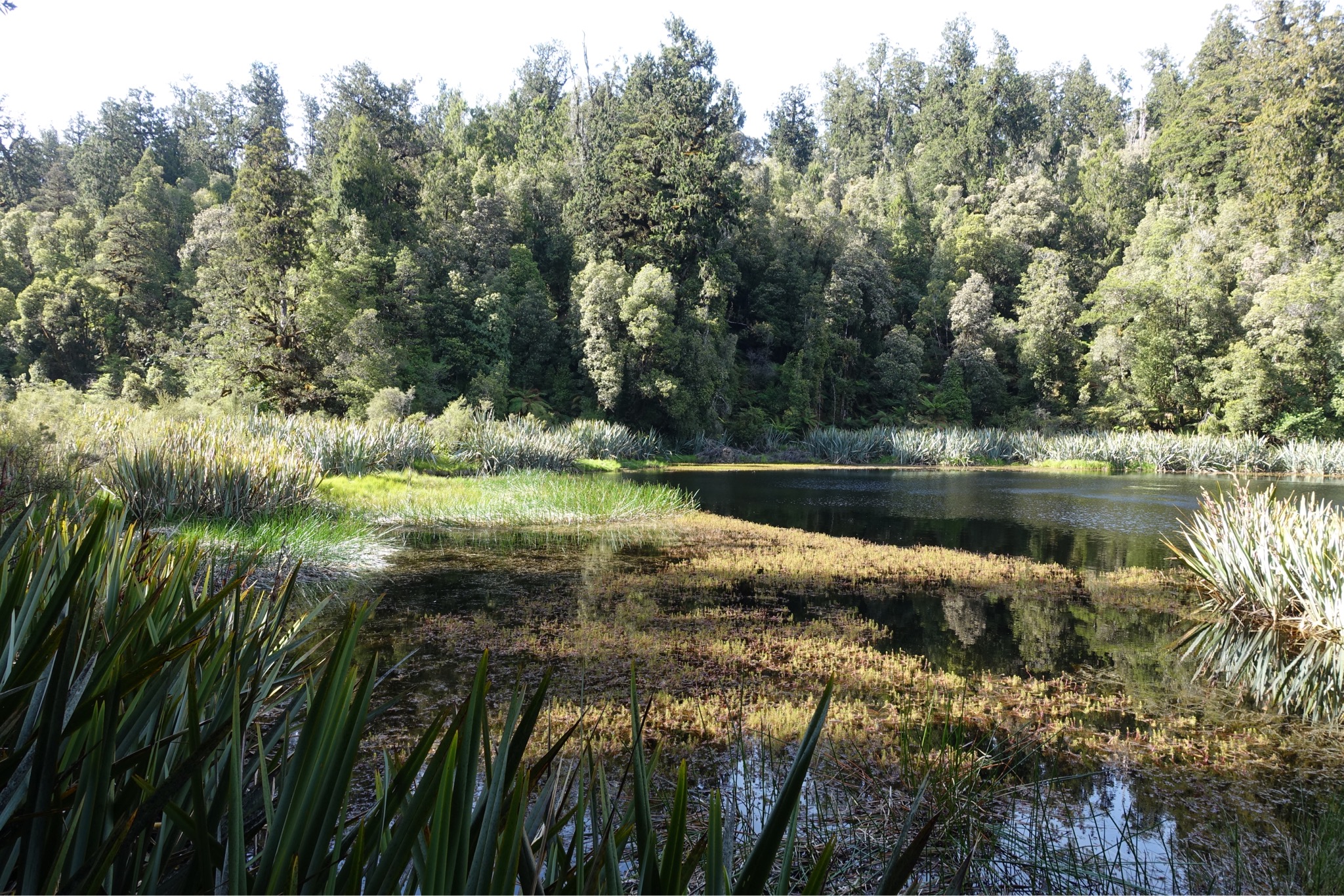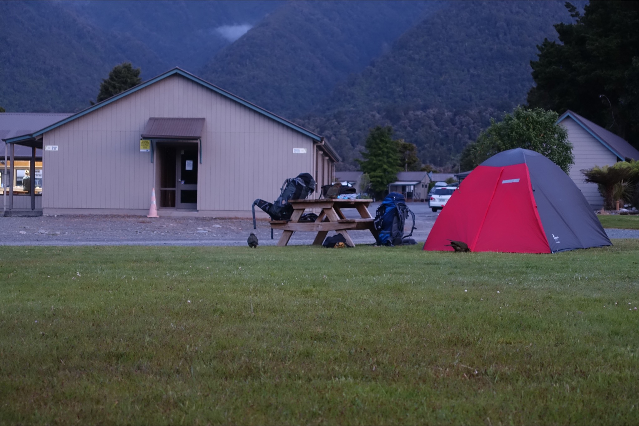 Der Besuch des Gletschers war so Lala. Halt ein Haufen Geröll mit etwas Eis am Schluß. Ich dachte, der Gletscher würde blau leuchten, aber denkste. Dafür war der Walkaround um den Lake Mapourika phantastisch. Eine 4,4 km Runde um einen See mit sehr dunklem Wasser ( mit fiesen Aalen, die angeblich auch kleine Vögel fressen) und durch super grünen Urwald. Der krönende Abschluss wartete dann abends auf dem Campingplatz. Die heiß ersehnten Keas, die sich am Gletscher nicht haben blicken lassen, sind zu dritt auf dem Campingplatz eingeflogen, haben Zelte und unbeaufsichtigte Rucksäcke untersucht und Kekse geklaut. Und einen unheimlichen Krach gemacht. Saucoole Viecher! Morgen wird’s ein langer Tag, daher versuche ich gegen 6.00 Uhr los zu kommen.