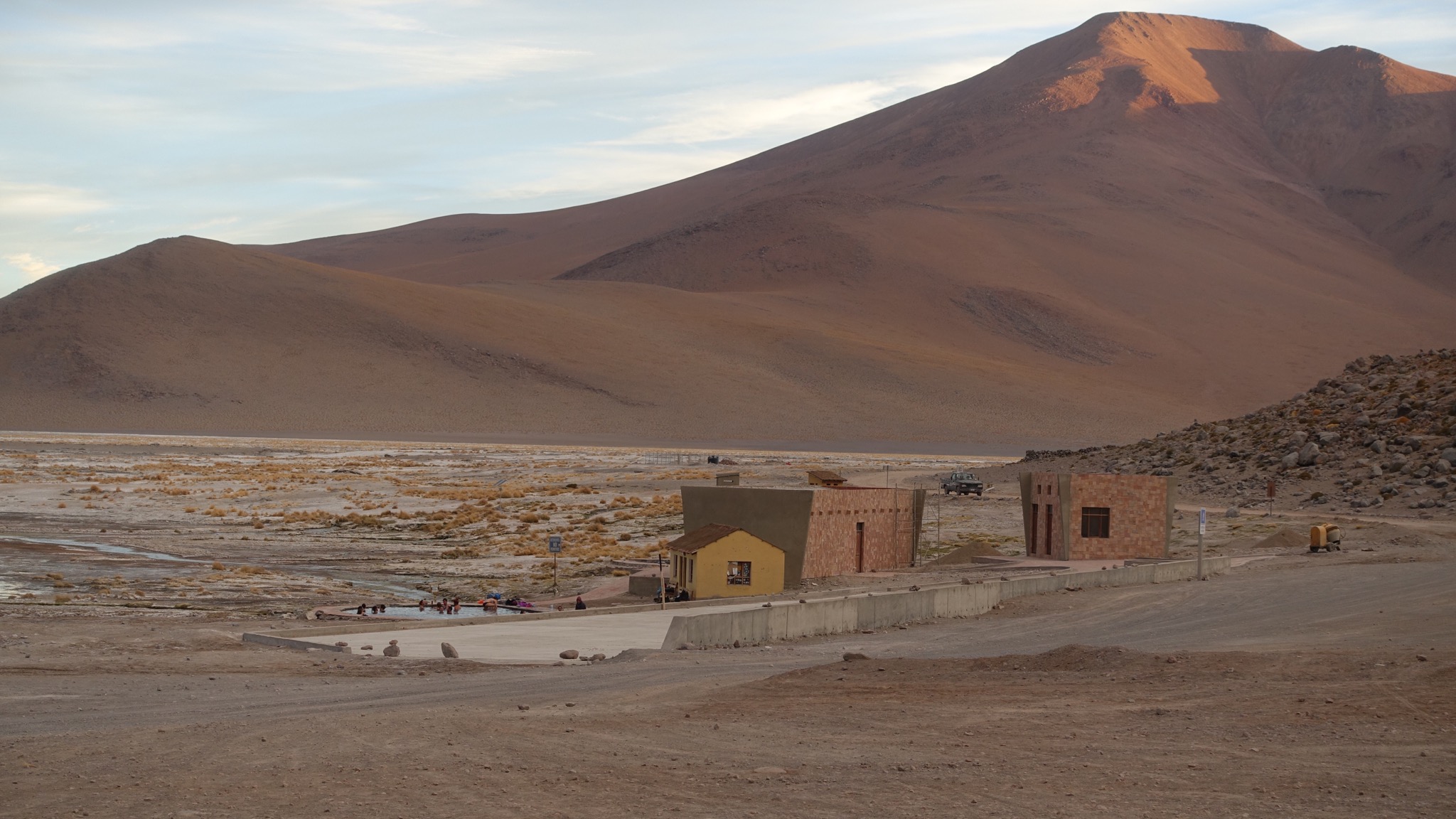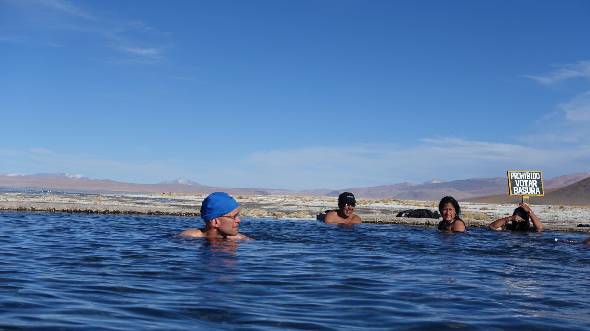 Das dritte Highlight war die Thermalquelle in unserenm Zielort. Etwa 35 Grad. Wir waren bestimmt 90 min in dem herrlich warmen Wasser und haben gefühlt, wie die die Energie zurück in den Körper strömt. Tja, und dann kamen die Australier angeradelt, die wir schon vor einigen Tagen getroffen haben. Das war das vierte Highlight. Sie waren auch von der Anstrengung der letzten Tage gezeichnet, hatten aber noch das zusätzliche Problem, dass sie fast keine Bolivianos und kaum noch etwas zu essen haben. Habe Ihnen daher die Hälfte von unserem Brot, eine Packung Nudeln und die geschenkte Dose Thunfisch vermacht.