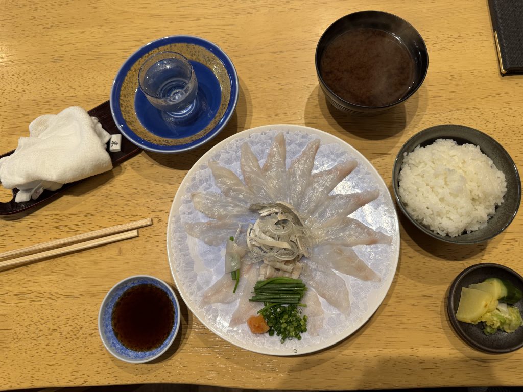 Ich habe mich für die Sashimi Variante entschieden. Also roher Fisch. Dazu gab es dann Frühlingszwiebeln, und ein anderes Gewürz und eine leicht säuerliche Sojasauße zum Dippen. Ich habe dazu noch Reis, eine Misosuppe (diesmal auf Muschelbasis), Gemüse und Sake bestellt.